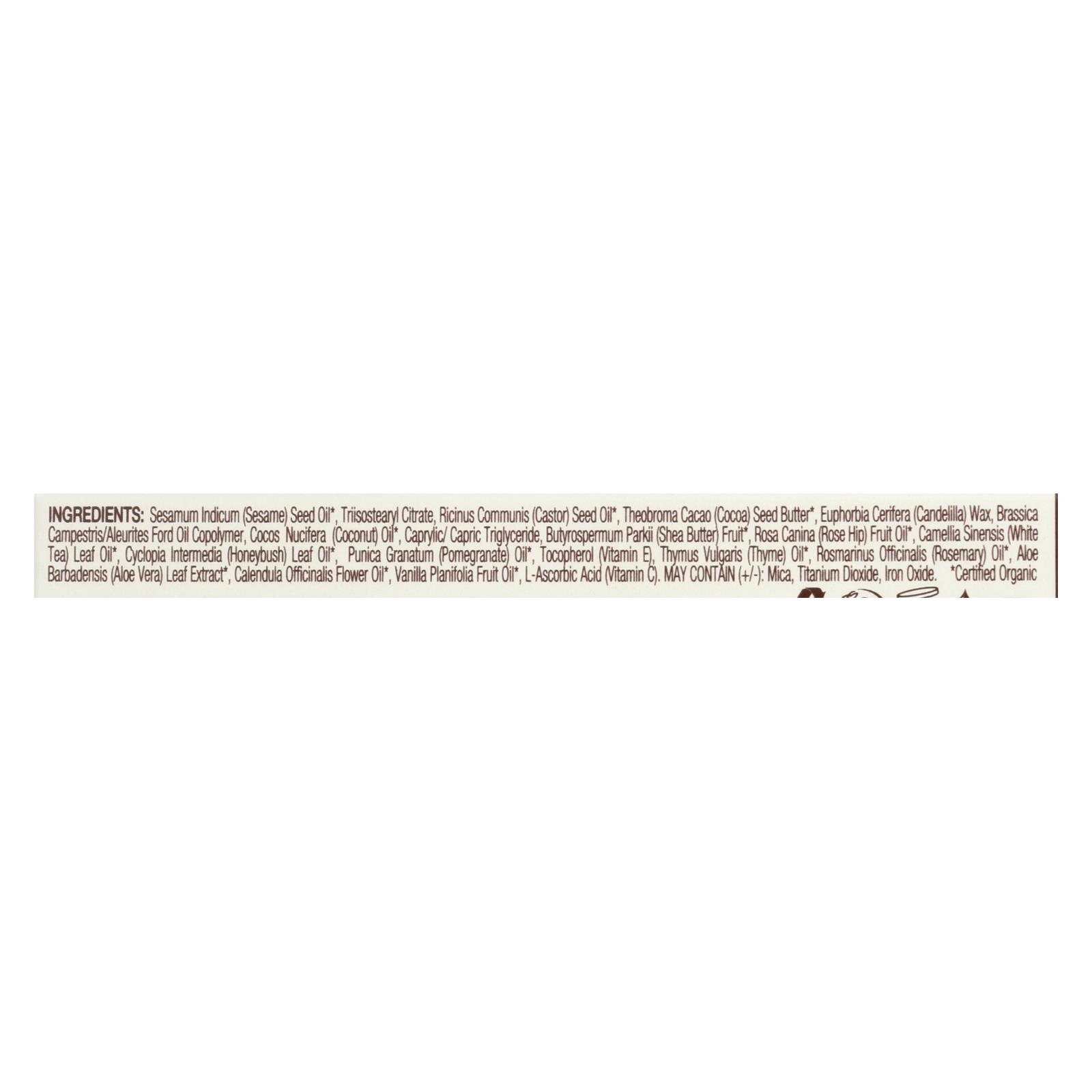 ingredients : sesamum indicum;sesame;seed oil;triisostearyl citrate;ricinus communis;castor;theobroma cacao;cocoa;seed butter;euphorbia cerifera;candelilla;wax;brassica campestris aleurites fordi oil copolymer;cocos nucifera;coconut;oil;caprylic/capric triglyceride;butyrospermum parkii;shea butter;fruit;rosa canina;rose hip;fruit oil;camellia sinensis;white tea;leaf oil;cyclopia intermedia;honeybush;punica granatum;pomegranate;tocopherol;thymus vulgaris;thyme;rosmarinus officinalis;rosemary;aloe barbadensis;a