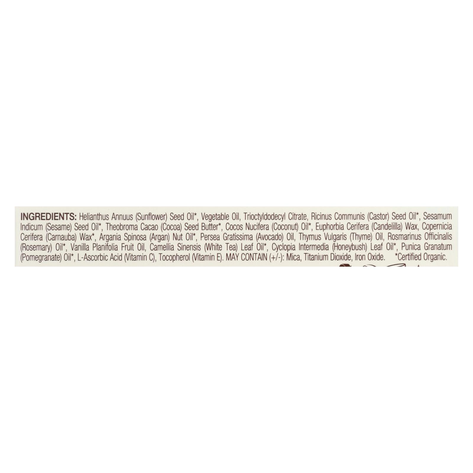 ingredients : helianthus annuus;sunflower;seed oil;hydrogenated vegetable oil;trioctyldodecyl citrate;ricinus communis;castor;sesamum indicum;sesame;theobroma cacao;cocoa;seed butter;cocos nucifera;coconut;oil;euphorbia cerifera;candelilla;wax;copernicia cerifera;carnauba;argania spinosa;argan;kernel oil;persea gratissima;avocado;thymus vulgaris;thyme;leaf oil;rosmarinus officinalis;rosemary;vanilla planifolia;vanilla;fruit oil;camellia sinensis;white tea;extract;cyclopia intermedia;honeybush;punica granatum;