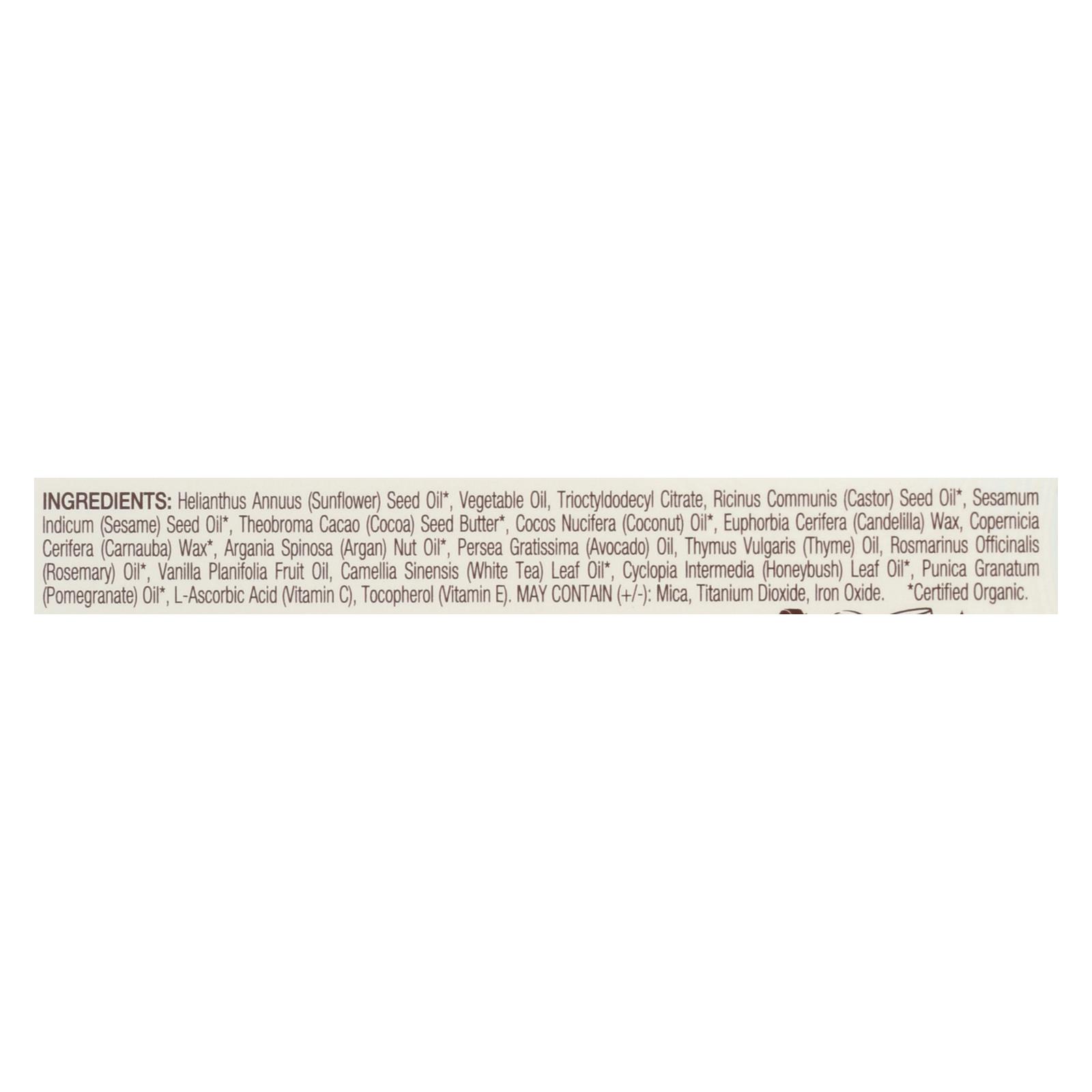 ingredients : helianthus annuus;sunflower;seed oil;vegetable oil;trioctyldodecyl citrate;ricinus communis;castor;sesamum indicum;sesame;theobroma cacao;cocoa;seed butter;cocos nucifera;coconut;oil;euphorbia cerifera;candelilla;wax;copernicia cerifera;carnauba;argania spinosa;argan;nut oil;persea gratissima;avocado;thymus vulgaris;thyme;rosmarinus officinalis;rosemary;vanilla planifolia fruit oil;camellia sinensis;white tea;leaf oil;cyclopia intermedia;honeybush;punica granatum;pomegranate;l-ascorbic acid;vita