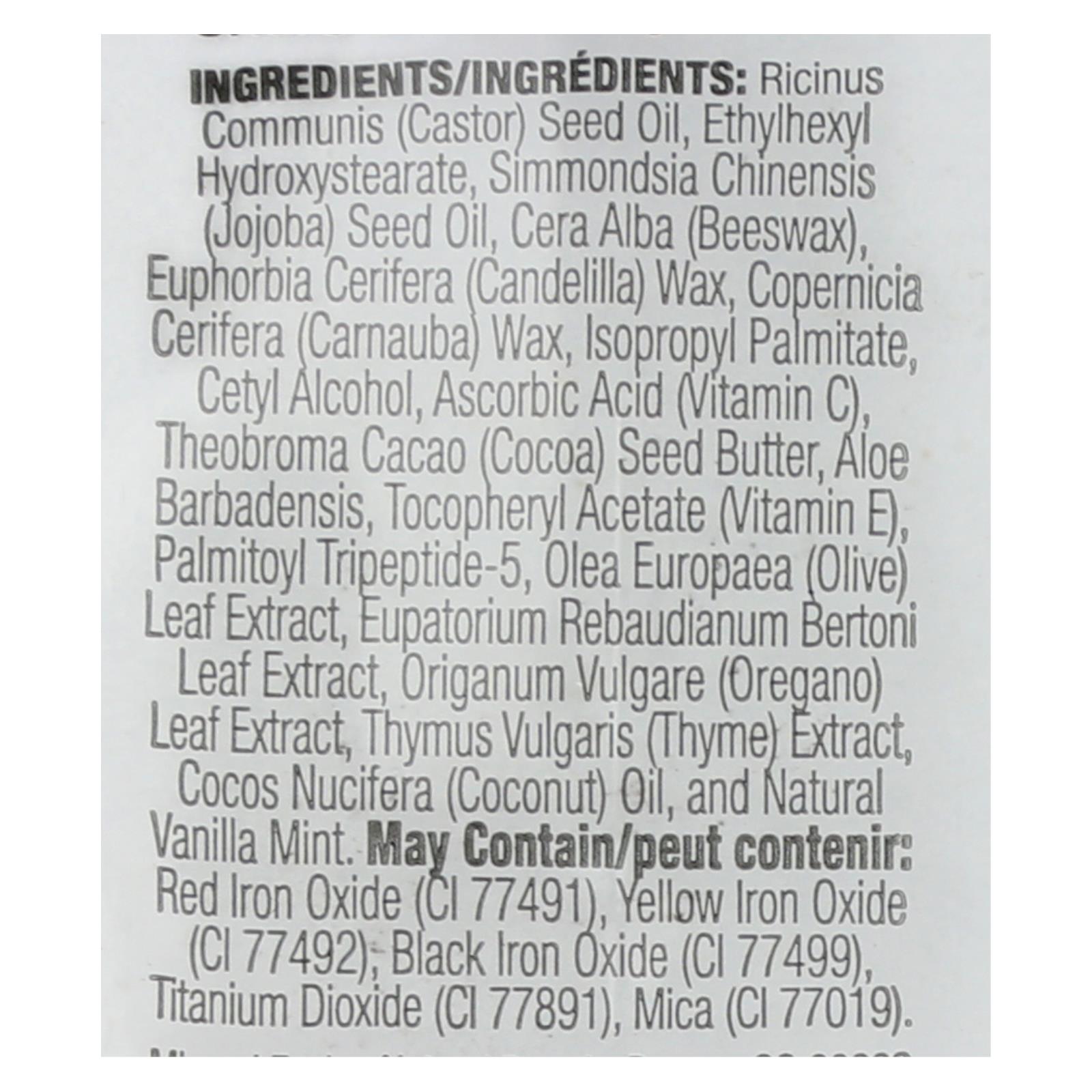 ingredients : ricinus communis;castor;seed oil;ethylhexyl hydroxystearate;simmondsia chinensis;jojoba;cera alba;beeswax;euphorbia cerifera;candelilla;wax;copernicia cerifera;carnauba;isopropyl palmitate;cetyl alcohol;ascorbic acid;vitamin c;theobroma cacao;cocoa;seed butter;aloe barbadensis;tocopheryl acetate;vitamin e;palmitoyl tripeptide-5;olea europaea;olive;leaf extract;eupatorium rebaudianum bertoni leaf extract;thymus vulgaris;thyme;extract;cocos nucifera;coconut;oil;and natural vanilla mint